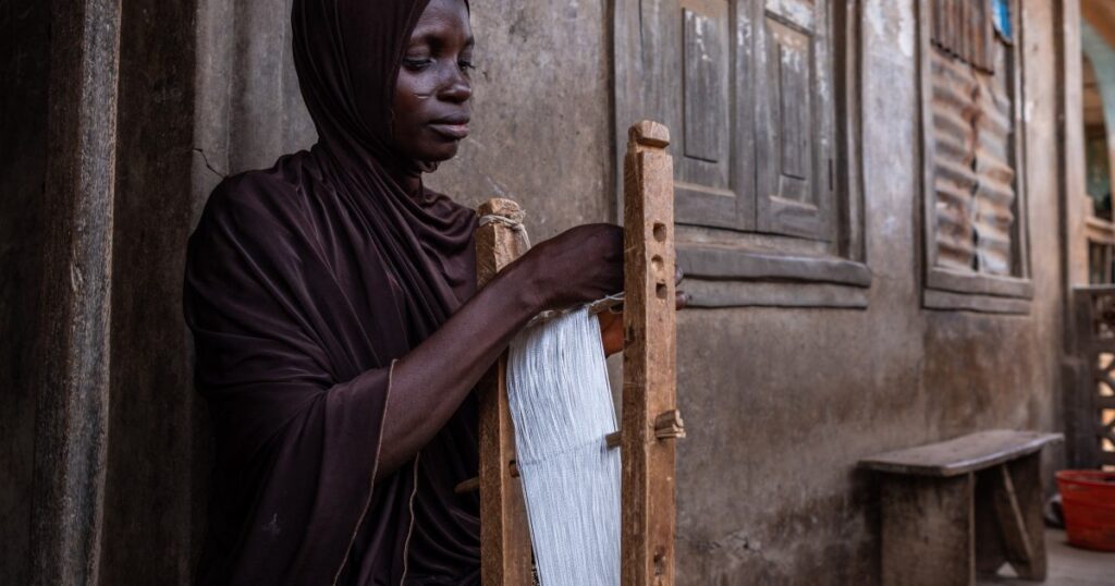 In Iseyin, a sleepy town in southwestern Nigeria, shaded spaces under trees, makeshift sheds, and narrow alleys serve as production hubs for aso-oke, a handwoven fabric indigenous to the Yoruba people.