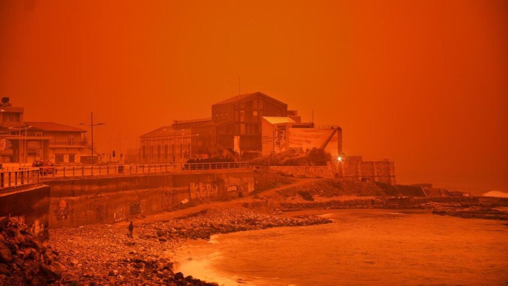 A late winter rainstorm that lashed southern Greece has turned the sky a surreal red, felled trees and resulted in the death of one man.